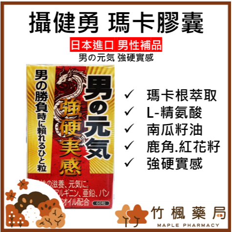 攝健勇配方 1. 南瓜籽油 800mg 2. L-精胺酸 540mg 3. 紅花籽油 4. 瑪卡根萃取 200mg 5. 鹿角菜膠 6. 蜂蠟 7. 卵磷脂 8. 鋅酵母 20mg 【產品名稱】攝健勇 【規格】60粒/盒 【食用方法】每日1-2次 每次1-2顆 【產地】日本靜岡縣 【注意事項】15歲以下小孩 懷孕 或哺乳期間婦女及服用抗凝血藥品、凝血功能不全之病患不宜服用。本產品含有大豆卵磷脂,不是盒對其過敏體質者食用。
