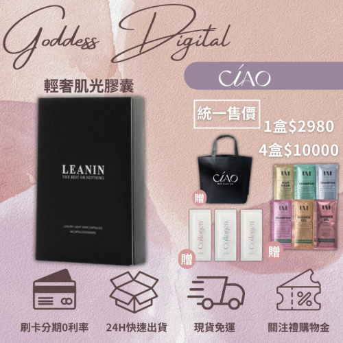 LEANIN輕奢肌光膠囊 售價2980元 (30顆/盒) 三大專利 五國認證 原料各項認證 ISO2200/HACCP認證 美國原料FDA/Gras 不含雌激素 成分介紹: PhytofloRAL專利冰晶番茄 100%日本原廠原酵母榖胱甘肽 美國專利長效型維生素C 食用方式: 每日睡前一顆即可 請勿過量 經期 女生 男生 可食 素食 懷孕 哺乳 不可食 建議年齡16歲以上 備孕屬於體質特殊時期 建議可先諮詢醫師 【食用方式】 每日睡前一顆即可 請勿過量 ⭕️經期 女生 男生 可食 ❌素食 懷孕 哺乳 不可食用 建議年齡16歲以上 備孕屬於體質特殊時期 建議可先諮詢醫師 https://s-cf-tw.shopeesz.com/file/tw-11134208-7r98r-lvlfaske5tet90 https://s-cf-tw.shopeesz.com/file/tw-11134208-7r98o-lvlfaske77z955 https://s-cf-tw.shopeesz.com/file/tw-11134208-7r990-lvlfaske8mjpb0