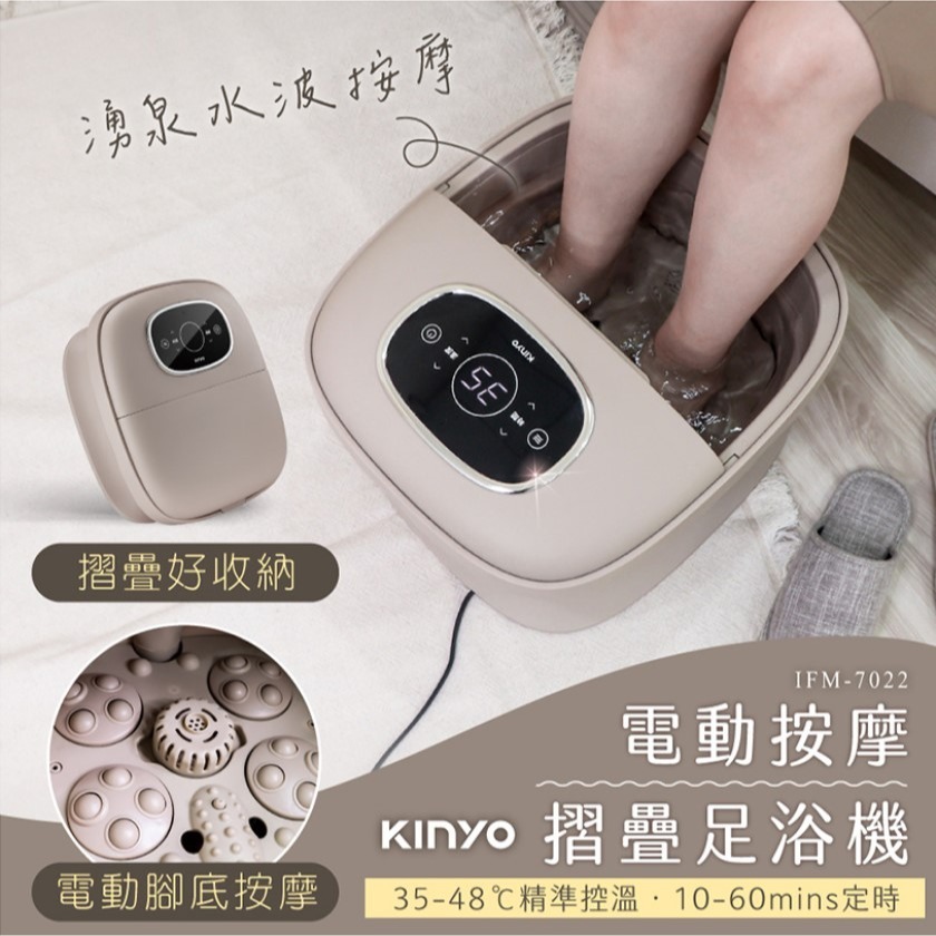 🔴依消保法公告此為個人衛生用品,基於衛生考量無法接受退換,請同意再下單。 -電子調控溫,每1℃精準控溫 -恆定溫暖水溫,採用PTC陶瓷發熱,安全可靠 -恆溫湧泉按摩,享受居家舒適SPA -腳底電動滾輪,深層按壓足底穴位 -藥草放置盒,集中添加藥材,保持水中乾淨 -防塌支撐桿,結構穩固升級,使用更放心 -底部萬向輪,輕鬆好移動 品牌品名:KINYO 電動按摩摺疊足浴機 型號:IFM-7022 材質:PP塑膠、TPE塑膠、ABS塑膠 展開尺寸:約350*295*410mm 摺疊尺寸:約350*180*410mm 淨重:約3600g 額定電壓:AC 110V 額定頻率:60HZ 額定消耗功率:490W 溫度範圍:約35-48℃ 最大裝水量:(MAX)約10L 最小裝水量:(MIN)約5L 電源線線長:約122cm 投保內容:已投保兆豐產物產品責任險2000萬元 BSMI認證字號:R4A106 配件:說明書*1+萬向輪*4 產地:中國製造/台灣監製 保固:主商品非人為損壞保固一年,贈品配件不在保固範圍內(維修需自行負擔來回運費) 使用方法 1.使用前請先將產品展開 2.加水至適當水位(水位需超過加熱器上蓋,且勿超過MAX線) ※添加之水溫請勿超過48℃,以免無法正常開機 3.裝水後接上電源通電,輕觸開關鍵,即可開始運作 ※開機預設為:恆溫42℃、定時60分鐘、電動滾論開啟 ※湧泉按摩為恆定開啟,無法關閉 4.輕按電動滾輪鍵,開啟/關閉足底電動按摩功能 5.確認水溫合宜後,即可放入雙腳享受足浴機 6.可將中藥草包放入【藥草放置盒】,搭配使用效果更佳 7.使用完畢請輕觸開關鍵,面板顯示「OF」即為關閉電源,請拔掉電源線,待加熱器冷卻後再將水倒掉,或打開排水口將水排除,排除完畢後將之蓋回 8.擦乾或晾乾,即可摺疊收納 ※腳底按摩底盤可拿起清潔 【腳底按摩底盤安裝】 方法1:底盤放回後不加水,手動旋轉滾盤後卡回到位 方法2:底盤放回後加水,啟動產品電源,輕壓底盤(非滾輪處)後,即可自動卡回到位 保存方式:請存放於室內陰涼通風處,避免高溫或陽光直射 注意事項: 1.請詳閱產品使用說明書或商品圖 2.本機須單獨使用電源插座,不得與其他電器共用指座(延長線)以避免發生危險 3.嚴格禁止沒有水的情況下加熱,以免發生危險 4.為保持本產品每次都可以在最佳狀態使用,每次使用請避免連續超過30分鐘,使用後最好休息間隔30分鐘 5.本機請勿站立使用,以免發生危險或機器損壞 6.請勿以自來水直接清洗本產品,以免水份滲入機內,易造成機體故障受損 7.若電源線損壞時,必須由製造商、其服務處或具有相關資格的人員更換,避免危險 8.電器有發熱表面,熱感覺遲緩者、60歲以上年長者、6歲以下小孩、酒醉者等請勿使用 9.病人(糖尿病、高血壓、慢性疾病、靜脈曲張、身心障礙、氣血貧弱者、孕婦、皮膚過敏者、無法自理者請勿使用,如有必要,需諮詢醫師後才可使用 10.若液體從電器中洩漏,則不宜再繼續使用該電器 11.本機不可作為醫療以及身體復健使用,僅供一般家庭個人養生保健之用 12.使用前後,建議飲用500CC的溫開水 13.加熱時間:20升溫至45℃約需30分鐘(所需時間依添加水温及環境温度不同而異) 14.飯前後1小時內請避免使用本產品,以避免消化不良 15.皮膚若有傷口會擴大病菌感染,請勿使用 16.請考慮自己身體狀況是否能够使用本產品 17.使用中若發生任何故障或異常,如有冒煙、異味、起火燃燒等狀況,請立即停止使用本產品,並請立即與本公司聯繫 18.泡腳機內腳底滾輪請勿重壓,避免過度使用導致腳底皮膚傷書以及機器損壞 19.本產品出廠前經嚴格加水測試,開封如有殘水屬正常現象 20.如未依照本須知說明使用,導致皮膚傷害或機器損壞,恕不提供維修保固及一切責任 21.由於本產品涉及個人衛生,除商品本身有瑕疵可辦理退換貨,使用後恕無法辦理退換貨 22.因每台電腦的顯色度不同,以及因拍攝地點光線所呈現的商品顏色無法完全相同,顏色請以實品為主
