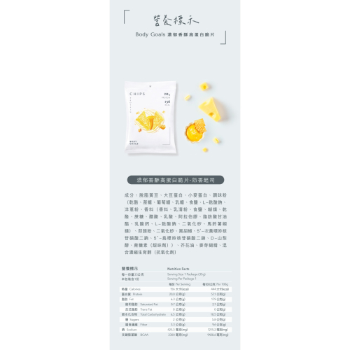 -蛋白質快充補給 -高纖富有飽足感 -非油炸,輕熱量 -大膽吃解饞0罪惡 -低溫烘烤不油膩 -富含膳食纖維 -無添加防腐劑、人工色素 -適合健身補給、飲食控制、熬夜追劇 品牌品名:Body Goals 濃郁香酥高蛋白脆片 【奶香起司】 成分:脫脂黃豆、大豆蛋白、小麥蛋白、調味粉(乾酪、蔗糖、葡萄糖、乳糖、食鹽、L-麩酸鈉、洋蔥粉、香料(香料、乳清粉、食鹽、糊精、乾酪、蔗糖、醋酸、乳酸、阿拉伯膠、脂肪酸甘油酯、乳酸鈣、L-麩酸鈉、二氧化矽、馬鈴薯糊精)、蒜頭粉、二氧化矽、黑胡椒、5'-次黃嘌呤核苷磷酸二鈉、5'-鳥嘌呤核苷磷酸二鈉、D-山梨醇、蔗糖素(甜味劑))、芥花油、麥芽糊精、混合濃縮生育醇(抗氧化劑) 【義式披薩】 成分:脫脂黃豆、大豆蛋白、小麥蛋白、調味粉(蔗糖、奶粉、食鹽、葡萄糖、香料(香料、乳清粉、食鹽、糊精、乾酪、蔗糖、醋酸、乳酸、阿拉伯膠、脂肪酸甘油酯、乳酸鈣、L-麩酸鈉、二氧化矽、麥芽糊精、乳糖、葡萄糖、5'-次黃嘌呤核苷磷酸二鈉、5'-鳥嘌呤核苷磷酸二鈉、檸檬酸、馬鈴薯糊精)、糊精、洋蔥、蒜頭、L-麩酸鈉、醋酸、辣椒、二氧化矽、5-次黃嘌呤核苷磷酸二鈉、5'-鳥嘌呤核苷磷酸二鈉、紅椒色素、奧勒岡粉、D-山梨醇、胺基乙酸、L-天門冬酸鈉、蔗糖素(甜味劑、琥珀酸二鈉、DL-胺基丙酸)、芥花油、麥芽糊精、混合濃縮生育醇(抗氧化劑) 【酸奶洋蔥】 成分:脫脂黃豆、大豆蛋白、小麥蛋白、調味粉(L-麩酸鈉、蔗糖、洋蔥、食鹽、葡萄糖、麥芽糊精、香料、酵母抽出物、鮮奶油、奶粉、小麥水解蛋白、蒜頭、氯化鉀、二氧化矽、琥珀酸二鈉、醋酸鈉(無水)、蔗糖素(甜味劑)、5'-鳥嘌呤核苷磷酸二鈉、5'-次黃嘌呤核苷磷酸二鈉、DL-蘋果酸)、芥花油、麥芽糊精、混合濃縮生育醇(抗氧化劑) 【墨西哥紅椒】 成分:脫脂黃豆、大豆蛋白、小麥蛋白、調味粉(蔗糖、L-麩酸鈉、食鹽、麥芽糊精、葡萄糖、洋蔥粉、黃豆水解蛋白、蒜頭粉、酵母抽出物、二氧化矽、檸檬酸、紅椒色素、黑胡椒、辣椒、辣椒抽出物、5'-次黃嘌呤核苷磷酸二鈉、5-鳥嘌嘌呤核苷磷酸二鈉、大豆油、胡椒抽出物、蒜頭抽出物)、芥花油、麥芽糊精、混合濃縮生育醇(抗氧化劑) 淨重:約35g/包 食品業者登錄字號:A-183784669-00000-9 投保內容:已投保產品責任險1000萬元 其他檢驗:經SGS檢驗通過 有效期限:依包裝所示 保存期限:1年 產地:台灣 食用方式:開封即食 保存方式:常溫保存,請保存於陰涼乾燥處,避免放置於潮濕、高溫悶熱或曝曬場所,開封後請儘早食用完畢 注意事項: 1.圖片僅供參考,內容物以實際包裝為主 2.素食可否食用: 【奶香起司】:否 【酸奶洋蔥】:否 【義式披薩】:五辛奶素 【墨西哥紅椒】:五辛素 3.孕婦可否食用:若有疑慮建議拿成分諮詢專業醫師,再評估是否可食用 4.哺乳可否食用:若有疑慮建議拿成分諮詢專業醫師,再評估是否可食用 5.生理期可否食用:若有疑慮建議拿成分諮詢專業醫師,再評估是否可食用 6.蠶豆症可否食用:若有疑慮建議拿成分諮詢專業醫師,再評估是否可食用 7.適合食用年齡:3歲以上,孩童建議由大人陪同食用 8.過敏原: 【奶香起司】:本產品含有大豆、牛奶、羊奶、含麩質之穀物及其製品,對其過敏者請避免食用 【酸奶洋蔥】:本產品含有大豆、牛奶、羊奶、蛋、含麩質之穀物及其製品,對其過敏者請避免食用 【義式披薩】:本產品含有大豆、牛奶、羊奶、含麩質之穀物及其製品,對其過敏者請避免食用 【墨西哥紅椒】:本產品含有大豆及其製品,對其過敏者請避免食用