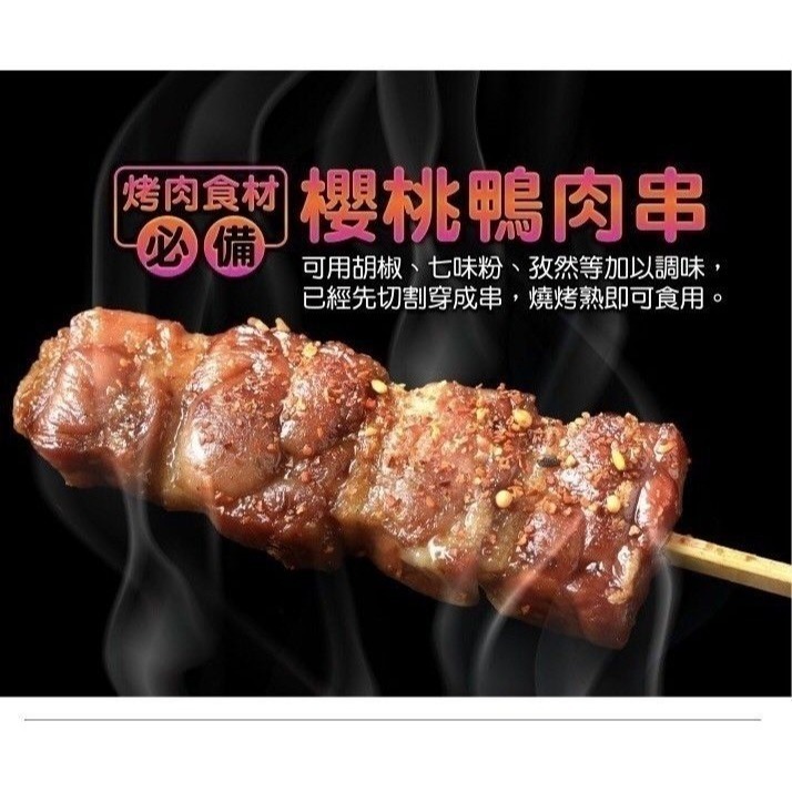 - 新鮮櫻桃鴨肉,精緻處理成串,真空包裝、冷凍封存,新嫩多汁、口感扎實,滿滿的鴨肉香味,煎、烤都非常適合!