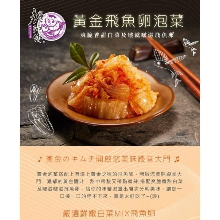 📌網購名店 顏師傅,堅持傳統日式工法製作,搭配野生飛魚卵,波滋波滋的口感!您最佳的輕食小菜首選。