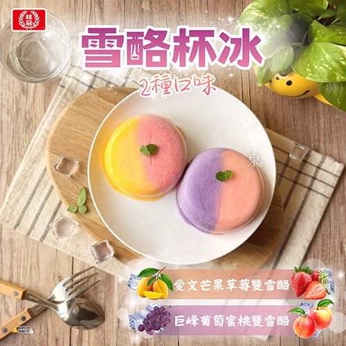 兩種人氣口味一次滿足,愛文芒果搭配草莓,香甜濃郁中帶點微酸層次;巨峰葡萄融合蜜桃,果香飽滿又清新柔和。細緻綿密的雪酪質地,入口即化,讓每一口都充滿夏日的輕盈感。不論午後小憩或餐後甜點,都能帶來剛剛好的清爽享受。