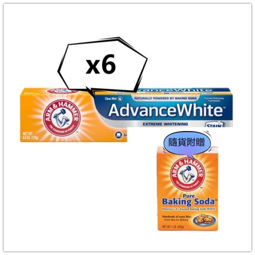 美國【Arm&Hammer】閃耀亮白牙膏(6oz/170g)*6加贈小蘇打粉(16oz)*6