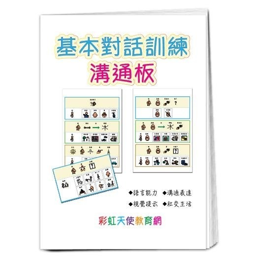 描述 14頁,A4尺寸。內容包括封面、教學使用說明、12頁包含28道基本對話溝通卡。附贈收納袋。 以視覺提示教育來啟發、加強學生/孩子的認知能力、口語能力、溝通表達及對話能力。 內容由特殊教育老師所設計,適合特殊教育學童或出現口語障礙的病患(包括失語老人)。 對話溝通板內容包括:(溝通訓練方法請看第二頁的教學使用說明) 你好嗎?我。很好、高興、累、不舒服(四選一) 你要什麼?我要。上廁所、休息、站一下、安靜、洗手、吃、喝、離開(八選一) 你喜歡買東西嗎?喜歡、不喜歡(二選一) 你喜歡買什麼?我喜歡。飲料、玩具、零食、衣服鞋子(四選一) ……共28道對話溝通圖卡