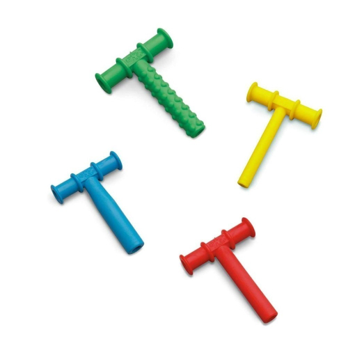 美國 T 字口腔肌肉咀嚼訓練咀嚼棒 (每個咀嚼棒都附贈收納盒) 產品特色: 自閉症兒童在使用耐嚼管時需要專業監督。 適合需要加強口腔肌肉,加強咀嚼能力,進而提升口語能力的兒童使用 咀嚼棒的耐嚼材質,有堅韌的彈性,不可食。用於練習咬和咀嚼技巧。 通過美國FDA核准,使用熱彈性聚合物材料製成,不含乳膠、PVC、鉛或鄰苯二甲酸鹽,絕對安全可靠。 耐高溫,每次使用前後可用熱水清潔消毒。 使用時需家長/老師在旁監督指導。 為安全衛生起見,一根咀嚼棒僅限一人使用。 注意:不建議 7 個月以下的兒童使用耐嚼管。 分有四種不同硬度的咀嚼棒,適合跟著口腔肌肉訓練的進度做調整。 請依照適合孩子的程度,選購適合硬度的咀嚼棒。 紅色(0級硬度-最軟), 綠色(2級硬度-硬), 藍色(3級硬度-最硬), 黃色(1級硬度-稍硬)