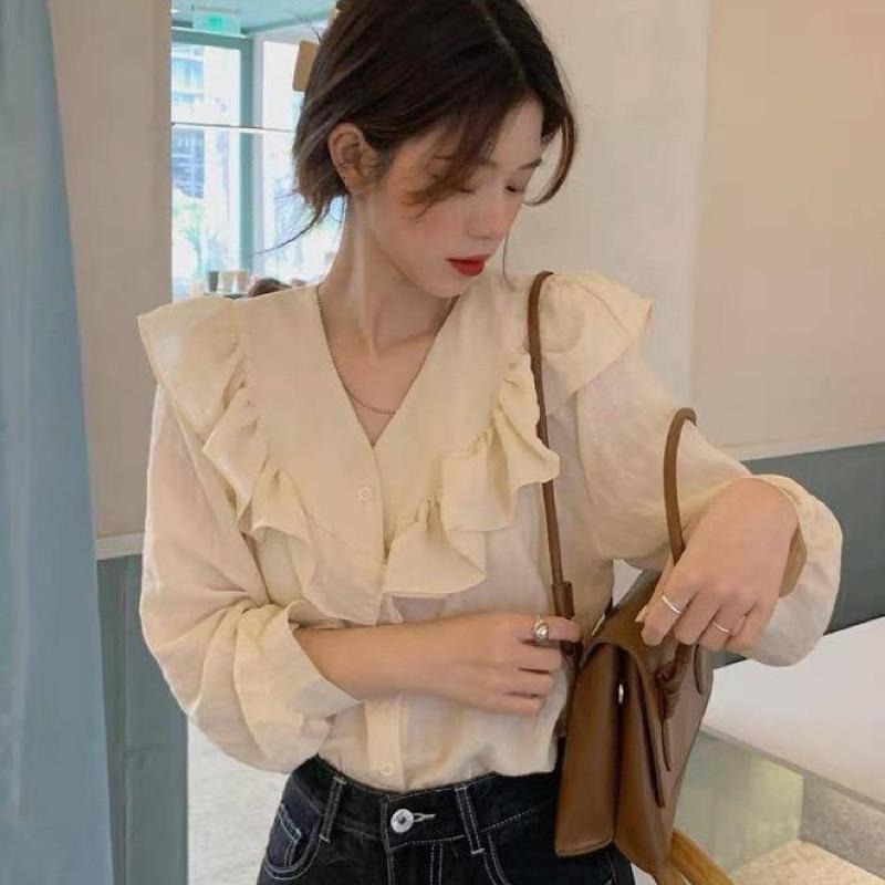 【B2101】韓系歐膩甜美荷葉邊襯衫 氣質上衣 開襟襯衫 春夏襯衫 溫柔風襯衫 透氣V領襯衫