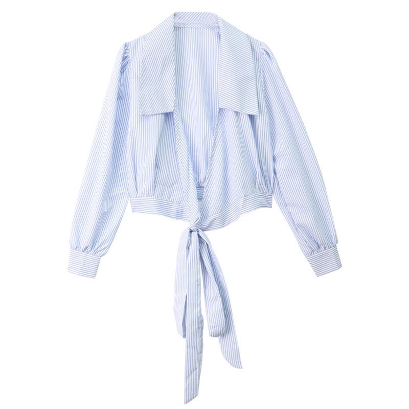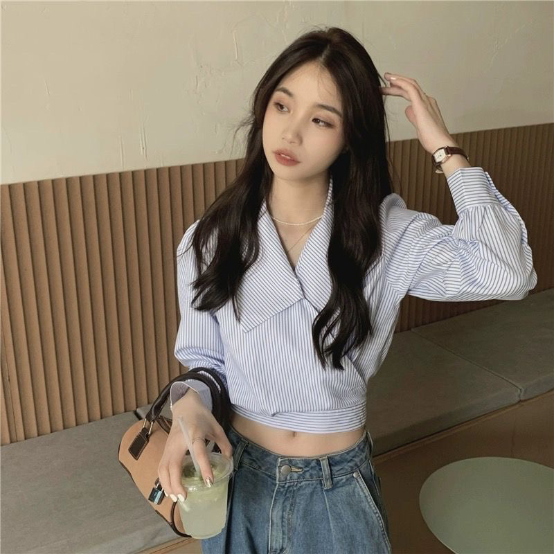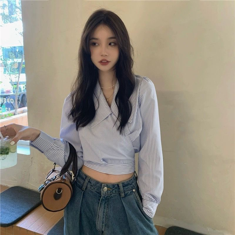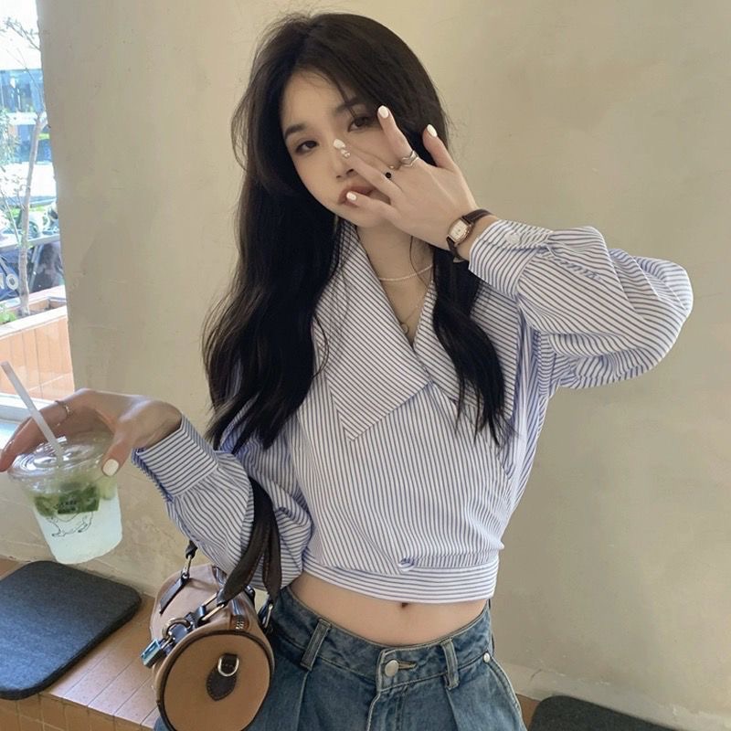 AS🤍 韓系 甜辣 高腰 設計感 小眾 條紋 長袖 襯衫 秋款 小個子 短款 上衣