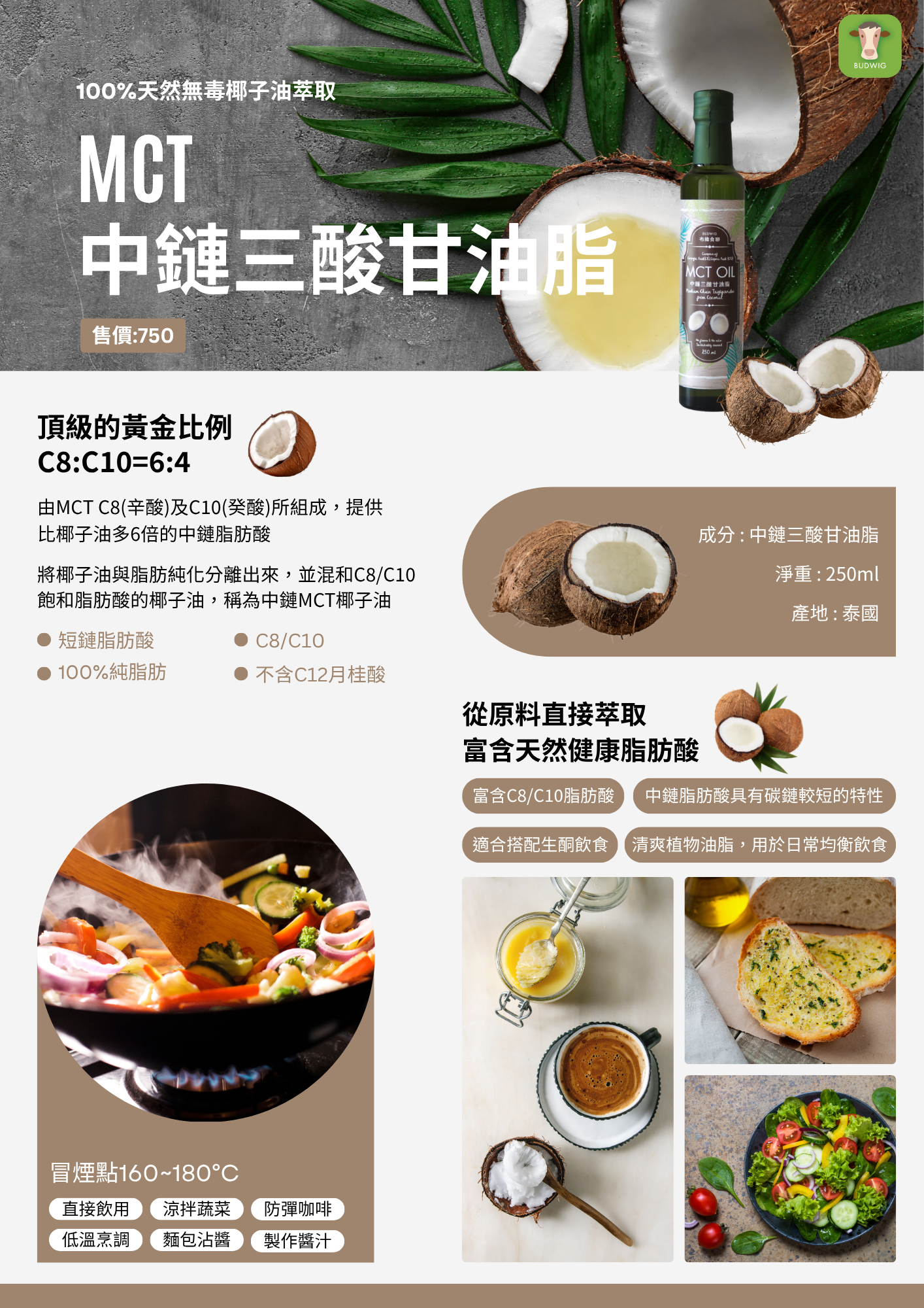 食用方式: 適合涼拌蔬菜、沾食麵包、高溫烹飪、防彈咖啡