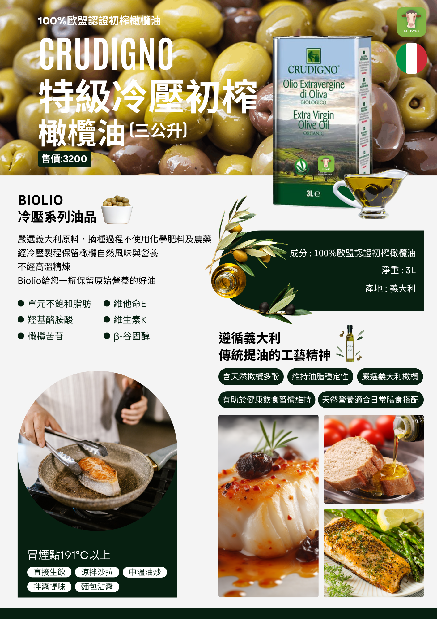👉🏻本油品,冒煙點191°C以上,適合中溫油炒、拌醬提味、涼拌沙拉、加入麵包沾醬或直接生飲