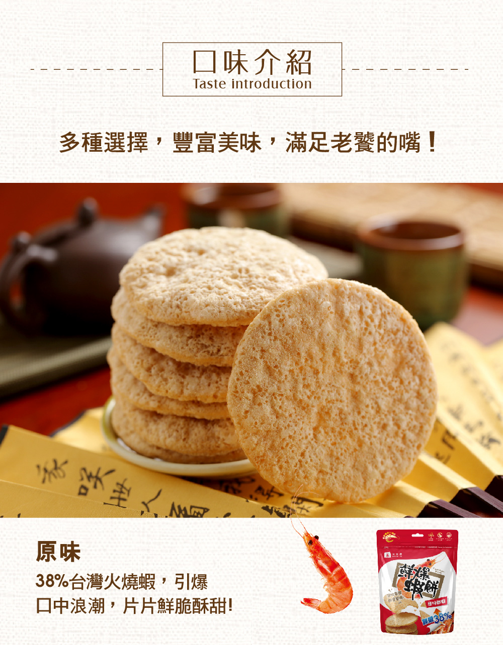 嚴選生長於台灣旗津優質海域的「火燒蝦」學名鬚赤蝦,蝦之甲殼較其他蝦厚,