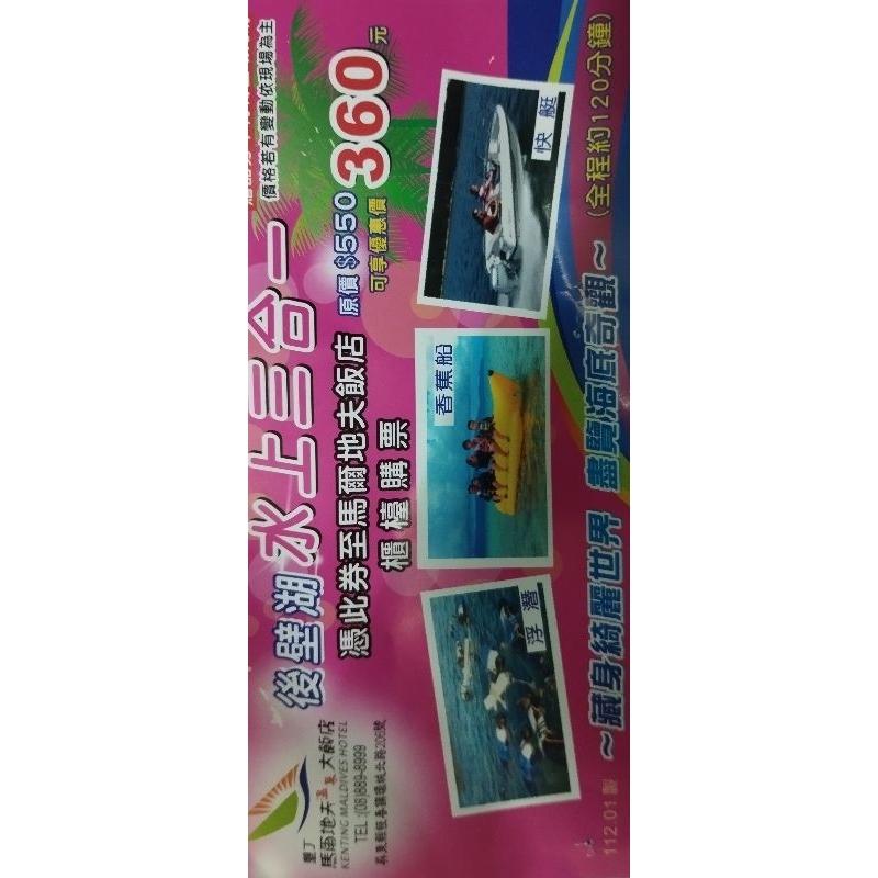 ⭐⭐⭐此券並非活動票卷,為求履約保證請購買此票券後,憑此券至。馬爾地夫飯店。櫃檯購票 購票後享履約保證,並立即享有水上設施旅遊保險 水上三合一行程,原價:550元;憑此券購票享優惠價:360元(一票限一人使用) 水上三合一:含括 浮潛➕香蕉船➕快艇 (水上活動全程約120分鐘) 註:墾丁馬爾地夫飯店,地址:946屏東縣恆春鎮環城北路206號