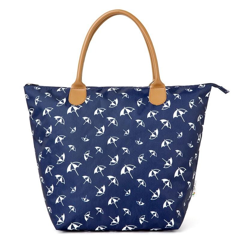 使用深藍底色、白色雨傘圖案、焦糖色環保皮革提把