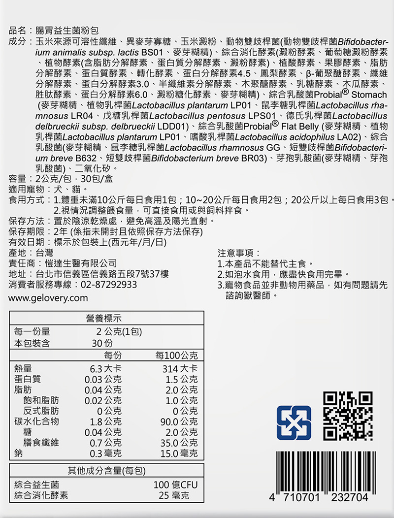 Gelovery歐萊寵物腸胃益生菌粉包 30包/盒