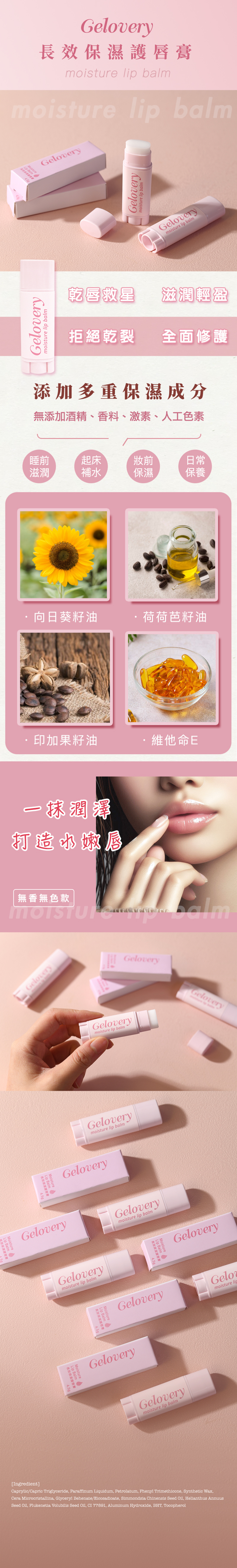 添加荷荷芭籽油、向日葵籽油、印加果籽油, 搭配維他命E深層滋養,為雙唇帶來極致呵護。 質地輕盈不黏膩,長效鎖水,讓雙唇時刻保持水潤透亮。