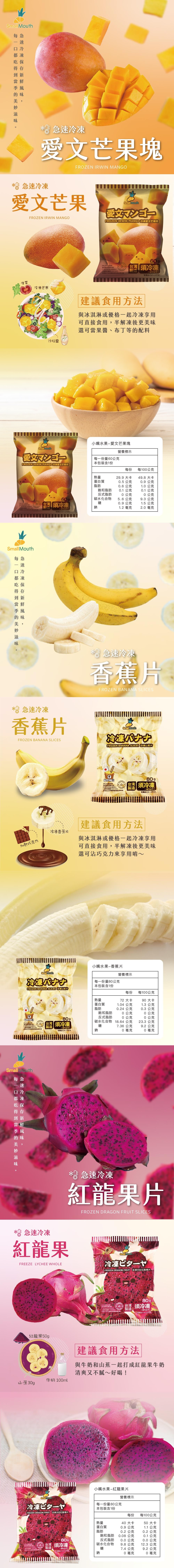 商品組合/規格:冷凍愛文芒果塊60g/包x3包+冷凍香蕉片80g/包x3包+冷凍大紅紅龍果片80g/包x3包+冷凍無籽檸檬片80g/包x3包