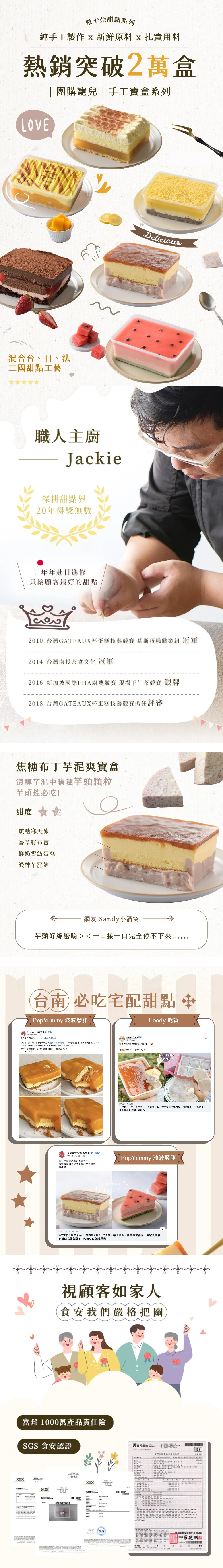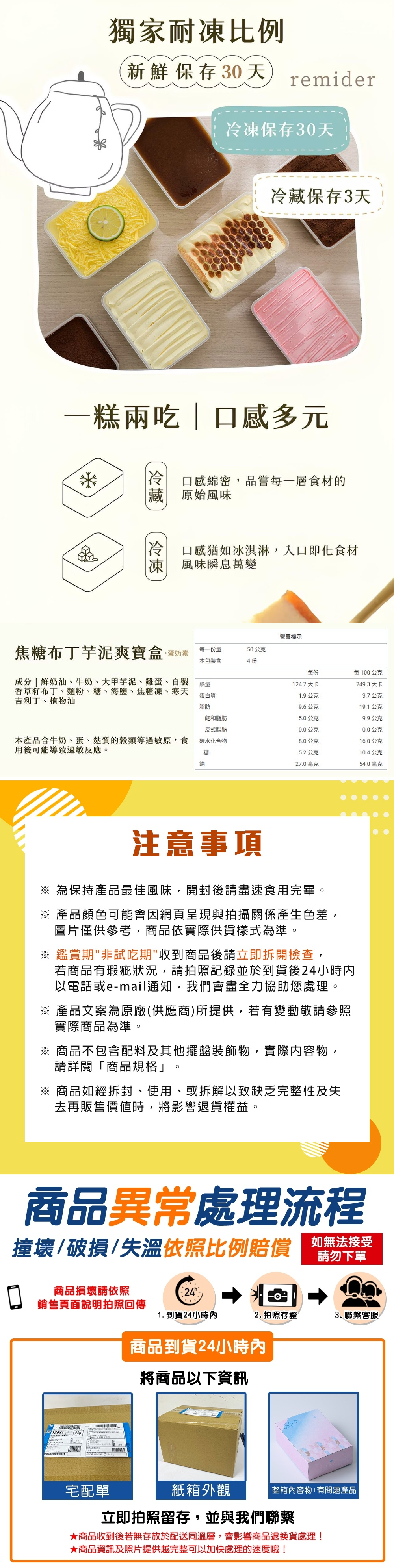 內容物成分(如含有豬、牛成分請加註國別):鮮奶油、牛奶、大甲芋泥、雞蛋、自製香草籽布丁、麵粉、糖、海鹽、焦糖凍、寒天吉利丁、植物油