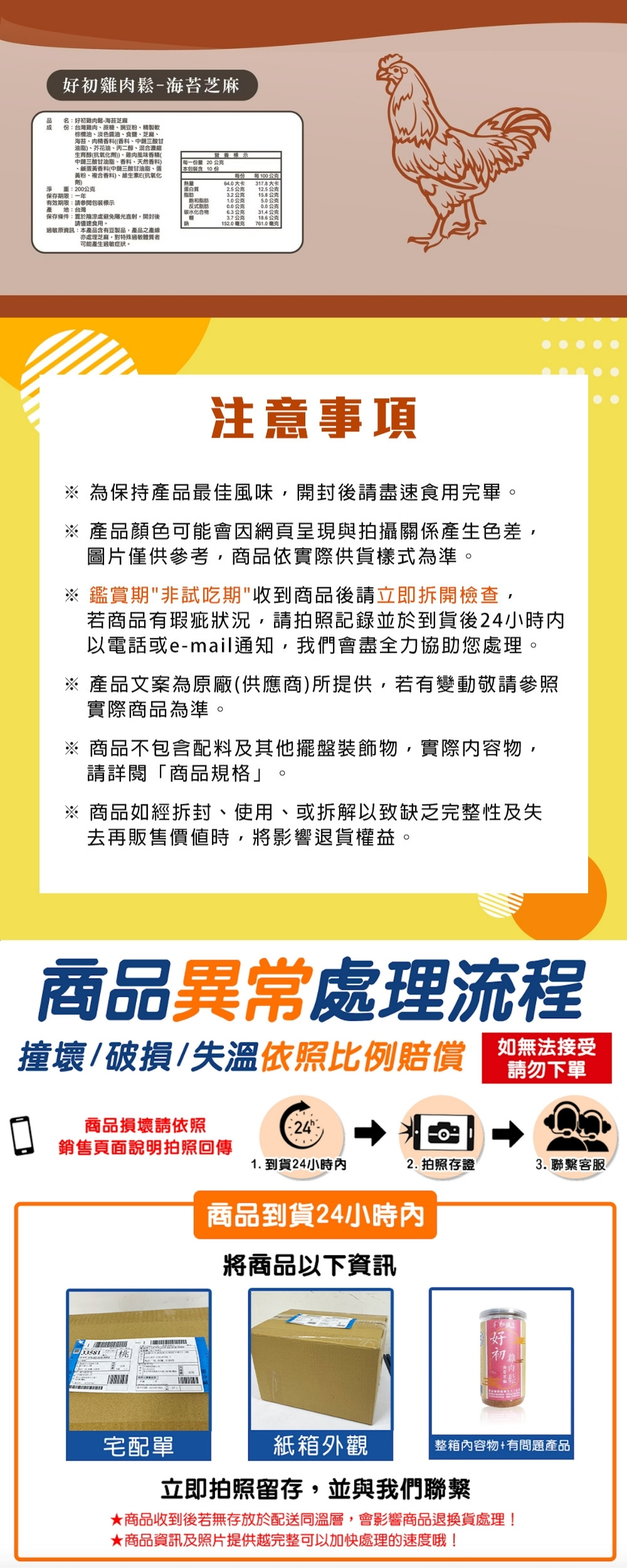 內容物成分(如含有豬、牛成分請加註國別):台灣雞肉、蔗糖、豌豆粉、精製軟棕櫚油、淡色醬油、食鹽、芝麻、 海苔、肉精香料((香料、中鏈三酸甘油脂)、芥花油、丙二醇、混合濃縮生育醇(抗氧化劑))、雞肉風味香精( 中鏈三酸甘油脂、香料、天然香料) 、鹹蛋黃香料(中鏈三酸甘油脂、蛋黃粉、複合香料)、維生素E(抗氧化劑)