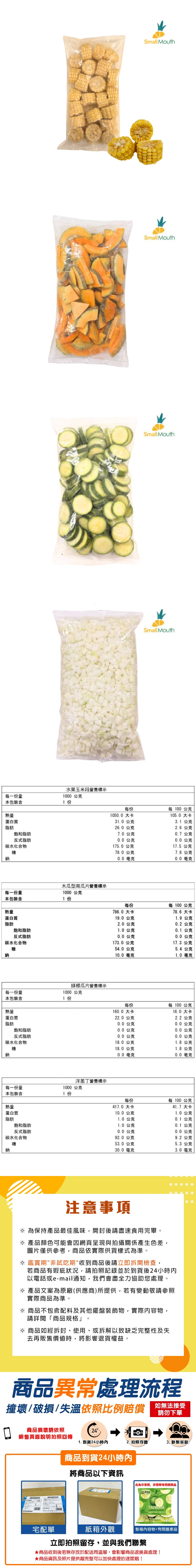 商品組合/規格:水果玉米段1kg/包x1包+木瓜型南瓜片1kg/包x1包+綠櫛瓜1kg/包x1包+洋蔥丁1kg/包x1包