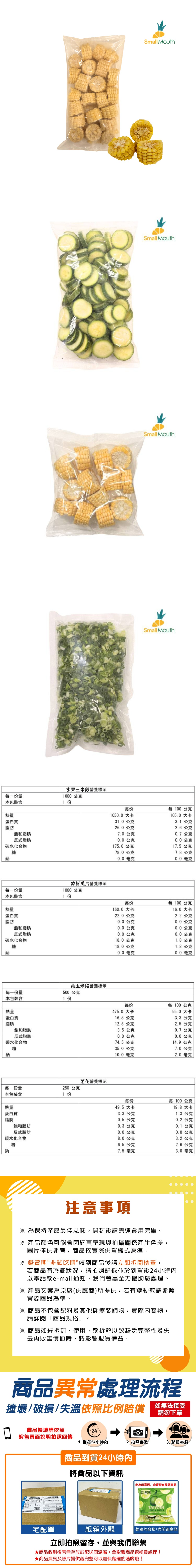 商品組合/規格:水果玉米段1kg/包x1包+綠櫛瓜1kg/包x1包+黃玉米段500g/包x1包+蔥花250g/包x1包