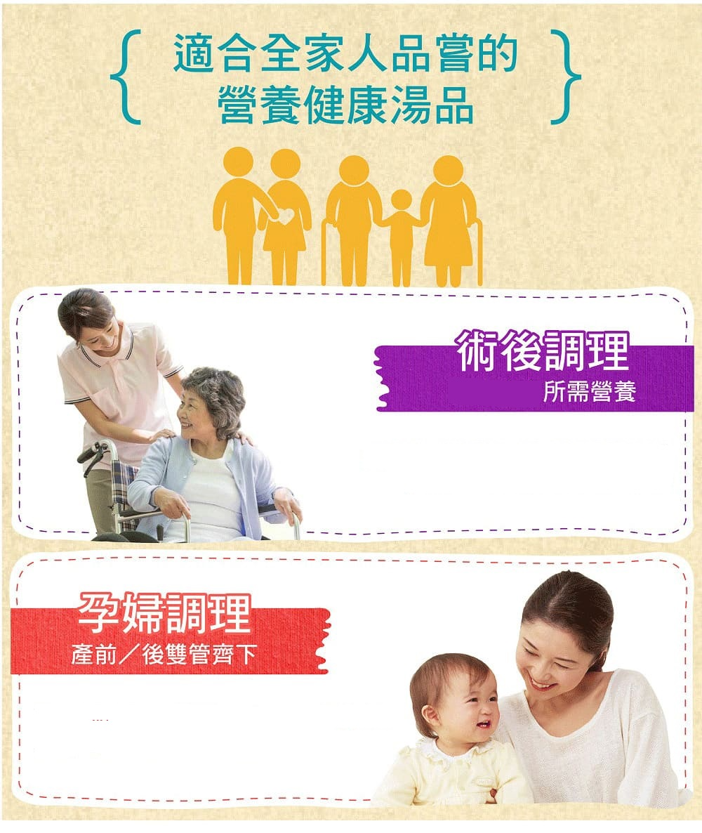 • 快速吸收養分,適合孕媽咪、術後調養富含高蛋白、豐沛膠質,低熱量、低脂肪、低鈉