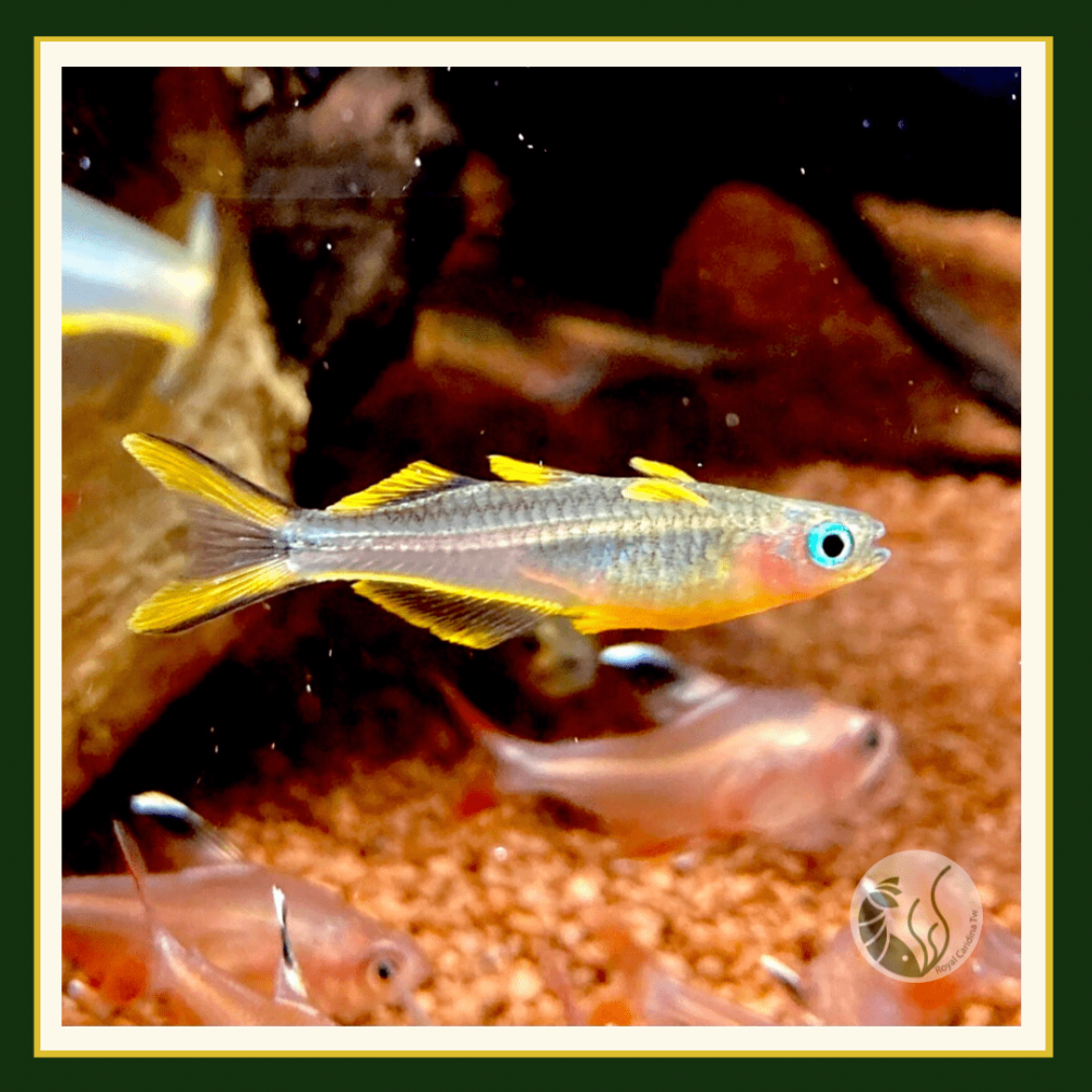 特色:體色以黃色及半透明為主,腹部為橘黃色,背鰭、胸鰭及臀鰭呈透明,但各其鰭緣處皆呈亮黃色。而雌魚的尾鰭呈淡黃色,胸鰭及腹鰭均呈透明,不及雄魚來的亮麗,另外健康的霓虹燕子在水族箱中相當活躍,若是發現其行動遲緩或行為呆滯,那就表示水質環境不適或已經感染得病。