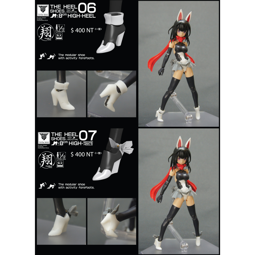 加高後跟版,1mmØ銅棒組裝,腳前可動,共兩種造型選擇,也結構可通用換裝,給1/12日本組裝模型女神裝置搭配改造使用。