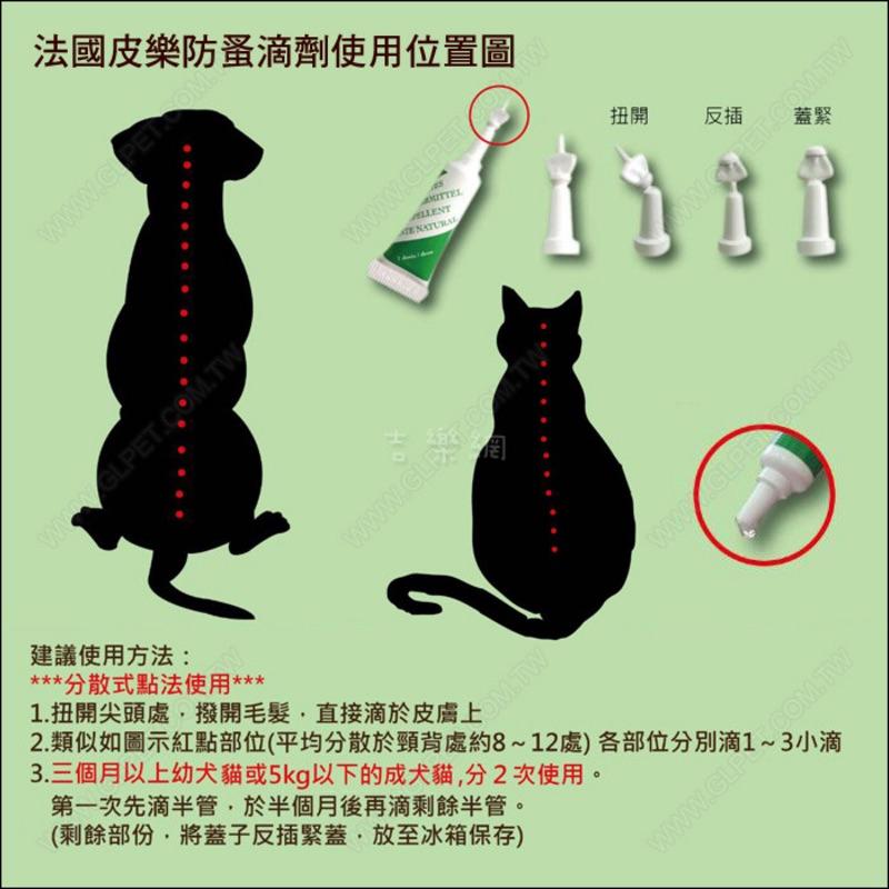 有新包裝以新包裝出貨喔~ ◆一管可分2~3次使用,開封使用後可維持一個月左右 ◆蓋子打開後可反蓋保存並可重複使用 ◆簡單使用並可長時間防護寵物 ◆100%法國原廠製造 (法國原裝進口) ◆ GMP法國工廠認證 (符合歐盟規範)        有效預防叮咬寵物的跳蚤、壁蝨、蚊子 及疥蟲及蹣蟲等寄生蟲。 天然植物活性成份香葉醇 實驗證明,這種活性的功效是至少等於化學合成品。 24小時全天候保護寵物及全家人的健康。 純天然植物配方 ,氣味清新自然 天然、快速、溫和、有效 保護寵物遠離跳蚤和扁蝨及其他寄生蟲長達4週 使用步驟簡單,滴在寵物頸部及背部臀部皮膚即可 每四週重複一次,加強防護效果 法國GMP原廠製造,符合歐盟規範 【滴劑成分】香葉醇,薄荷和薄荷油,杏仁油 【商品產地】法國 【使用方法】 使用於寵物頸部及背部 將毛髮撥開直接滴入皮膚上即可,無需按摩。 【注意事項】 ⚠️「7日鑑賞期」非「7日試用期」⚠️ 若該商品拆封後有接觸性之衛生疑慮,無法提供退貨服務哦! ✎賣場無換貨服務,請退貨後重新下單 ✎如有退貨需求,不要點選【完成訂單】,以免影響後續退款流程 ✎鑑賞期非試用期,欲退貨的商品必須為全新狀態且原完整包裝 ✎如漏寄或商品瑕疵請聯繫袋鼠媽。 ✎環保至上→部分商品會回收利用舊紙箱、乾淨舊報紙、乾淨舊泡棉包裝 【出貨時間】 ✎出貨時間:下單後1-2天內出貨 (週六、周日及國定假日不出貨) ✎店到店:出貨後通常約2-3天到貨,蝦皮店到店則無法斷定 ✎宅配郵寄出貨:出貨後約1-2天到貨 (不含六日) ⚠️訂單顯示「訂單處理中」表示進入包裝作業中恕無法取消訂單⚠️