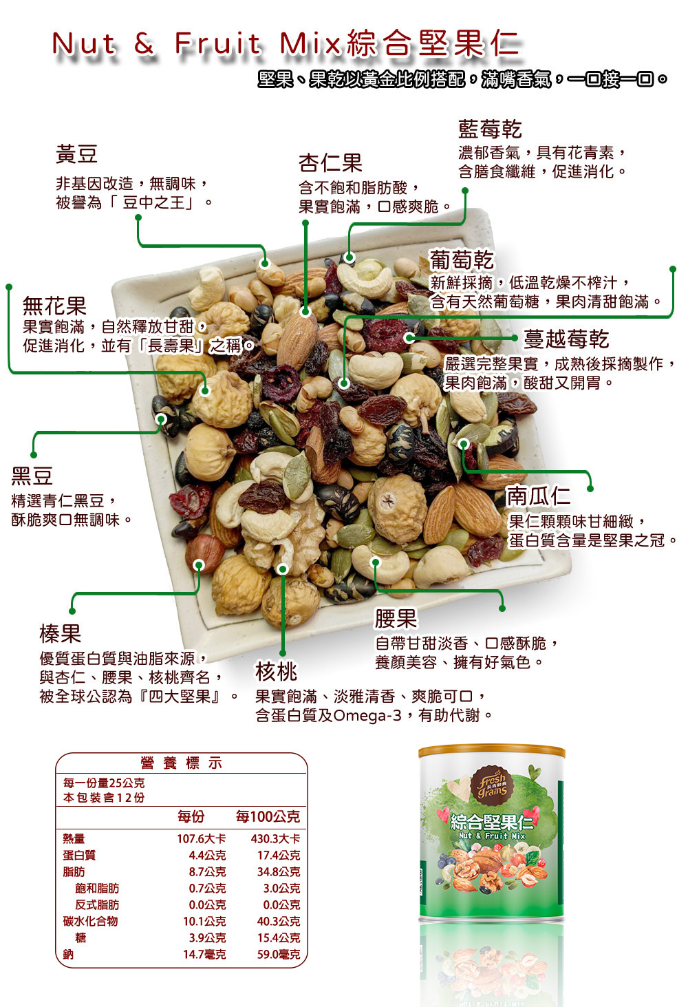 成分:無花果、杏仁果、腰果、黑豆、南瓜仁、葡萄乾(葡萄乾、葵花油)、核桃、蔓越莓(蔓越莓、糖、葵花油)、黃豆(非基改)、藍莓乾(藍莓、糖、葵花油)、榛果、岩鹽