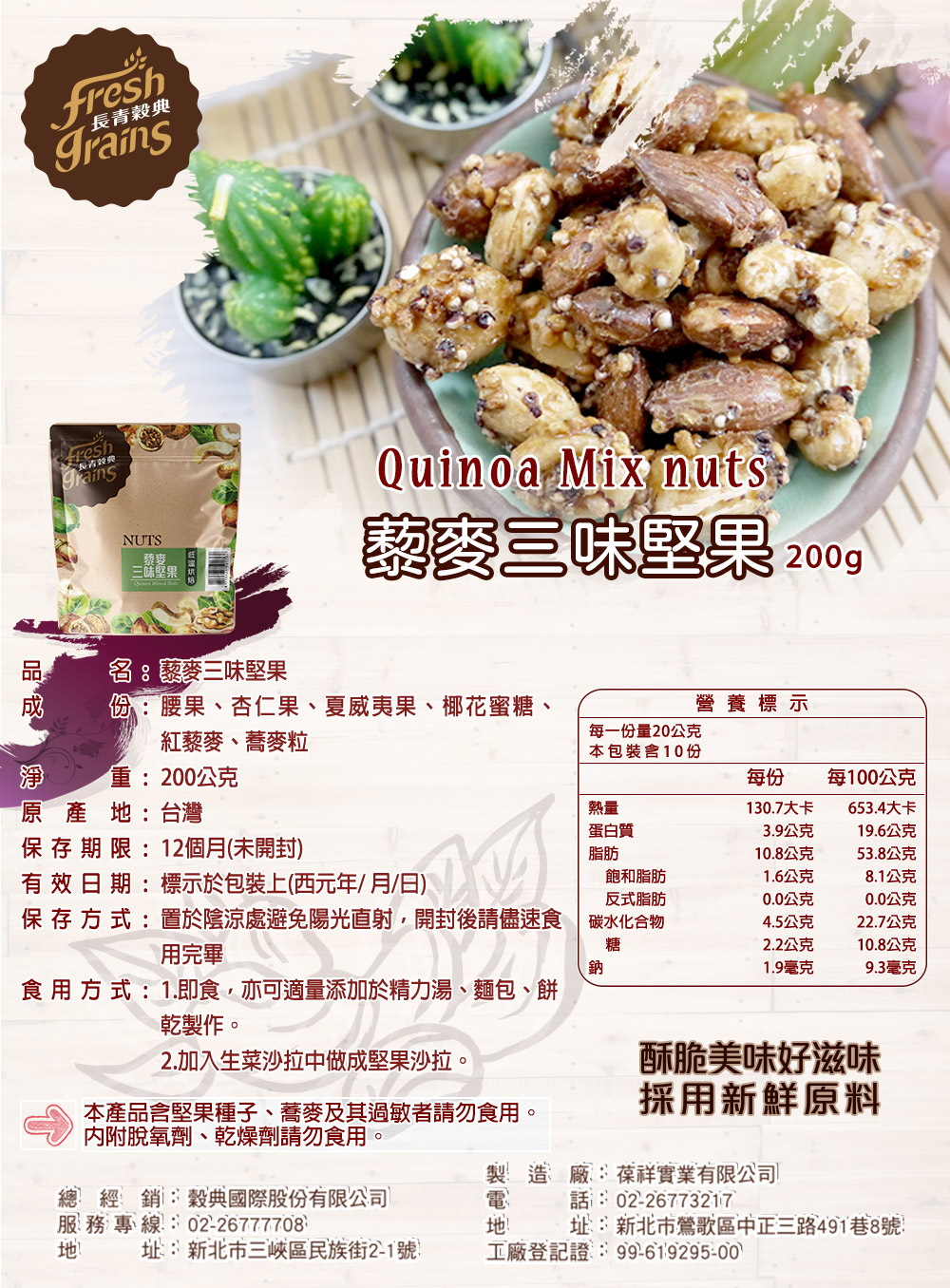 成分:腰果、杏仁果、夏威夷果、椰花蜜糖、紅藜麥、蕎麥