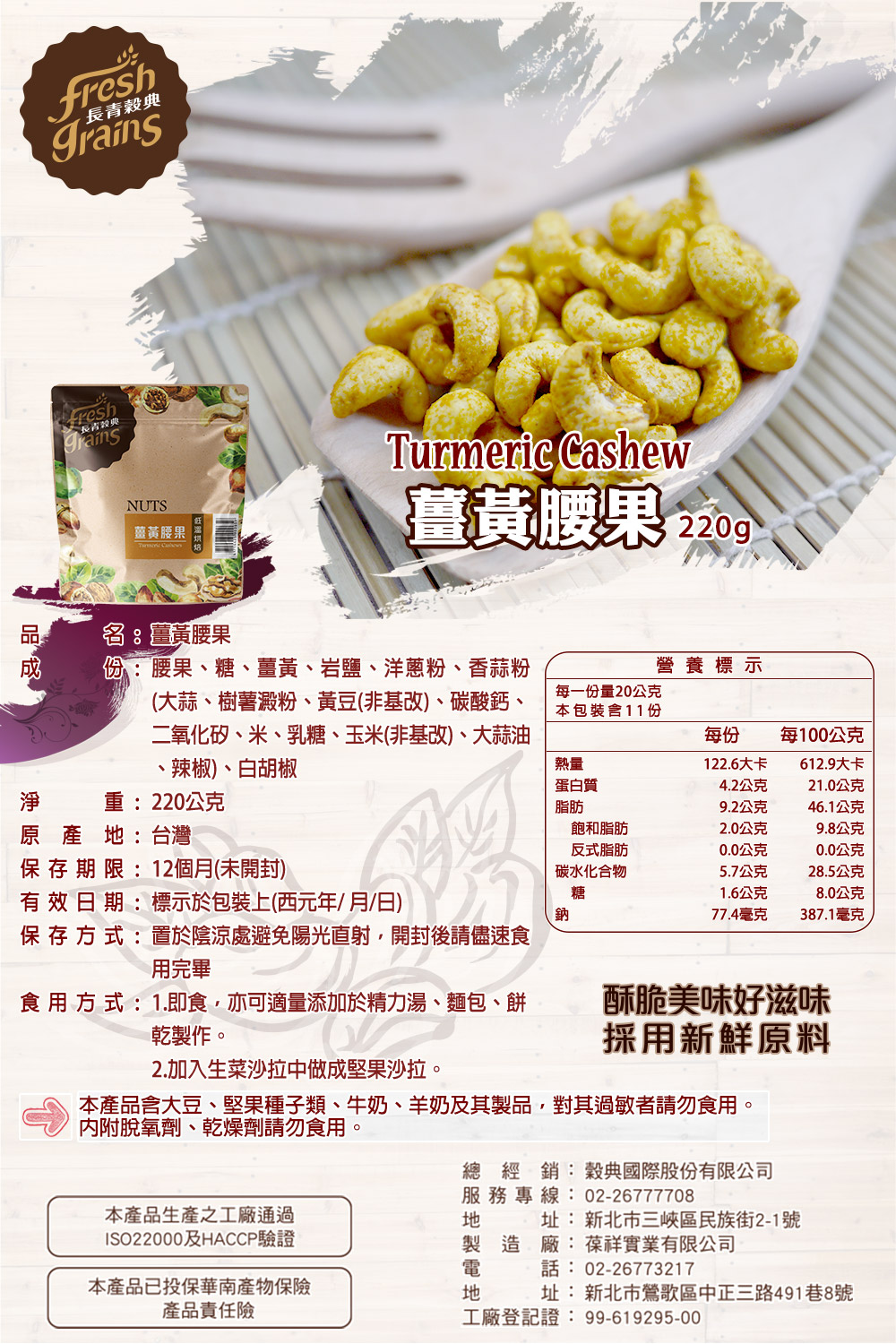 薑黃腰果:腰果、糖、薑黃、岩鹽、洋蔥粉、香蒜粉 (大蒜、樹薯澱粉、黃豆(非基改)、碳酸鈣、二氧化矽、米、乳糖、玉米(非基改)、大蒜油、辣椒)、白胡椒