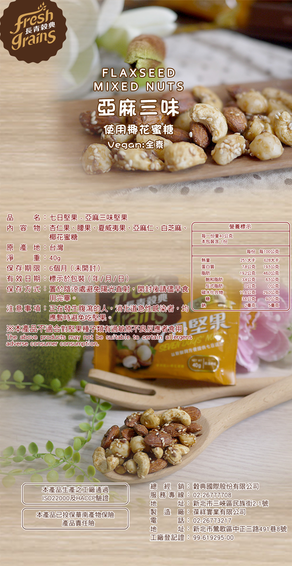 亞麻三味堅果:杏仁果、腰果、夏威夷果、亞麻仁、白芝麻、椰花蜜糖