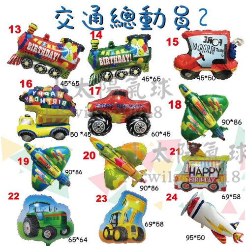 §用佈置溫暖對方的心靈§ ------------------------------------------------------------------------------------------------------------------------------------------------------------------------------- 醬~醬~~醬~醬❗❗❗❗ 小太陽氣球行強烈推出👍👍超級可愛的交通總動員系列氣球❤️❤️ 讓你的PARTY更活潑~~🙌🙌🙌 商品內容: 1.噴射戰鬥機-速速(85*98cm) 2.野戰坦克車-轟轟(79*68cm) 3.正義小警車-嗶嗶(74*65cm) 4.負責任火車-噗噗(82*69cm) 5.守護童校車-叮咚(62*87cm) 6.勇敢砂石車-咚咚(82*69cm) 7.救援消防車-嗚嗚(80*87cm) 8.使命救護車-咿咿(86*62cm) 9.智慧古飛機-哒哒(96*80cm) 10.幸福藍客機(82*45cm) 11.探險家噴射機-咻咻(75*43cm) 12.幸福紅客機(82*45cm) 13.夢想小火車-噗噗(65*45cm) 14.成真小火車-噗噗(65*45cm) 15.高爾夫球車-揮揮(45*50cm) 16.氣球小貨車-喀喀(45*50cm) 17.越野皮卡車-隆隆(45*60cm) 18.噴射戰鬥機-綠牛(90*86cm) 19.噴射戰鬥機-青雉(90*86cm) 20.噴射戰鬥機-黃猿(90*86cm) 21.酷聖石冰淇淋餐車-叭叭(69*58cm) 22.農用推拉機-嘟嘟(65*64cm) 23.黃蜂推土機-咚隆(69*58cm) 24.先鋒雲梯車-喔喔(67*70cm) 另外家中沒有打氣筒的各位別忘了到我的商場加購唷~~🔔 ------------------------------------------------------------------------------------------------------------------------------------------------------------------ 🌟注意🌟 ✅氣球損壞:氣球 🎈商品均有3%的損壞率,這是整個行業無法避免的現象,請提前或者選購備用球🎈,也可使用透明膠帶補強 ✅出貨時間:收到訂單後🔥24小時內火速出貨🔥,賣場9成以上是現貨😍,若碰到缺貨會另行告知,請下單後注意賣家的聊聊 ✅收貨時間:蝦皮正常配送貨到達時間2-3天🚚,同縣市有機會隔天,急單可改用宅配或其他配送方式,運費皆實收,請聊聊討論 ✅氣球色差:鋁箔氣球🎈印刷時每批顏色多少有些色差,介意的買家請勿下單唷🙏 ✅打氣氣量:由於氣體熱漲冷縮,建議打8分🈵️,邊緣有皺紋是正常現象(打氣時小心誤將封口墊片搓破) ✅重複使用:可插入細長吸管進行消氣,重複使用💕 ✅寄送方式:不充氣寄送 ✅保存方式:離開高溫環境、避免陽光直射、放在乾燥環境下💖 ✅超過20種:相似商品請選購一種並下標需要的數量,並備註告知需要什麼種類的氣球 🎈即可 💯關於評價:我們很認真經營賣場,🚀經常忙到半夜兩三點,也非常用心服務每一位顧客💖,真心感謝您的購買❤️, 對於給予我們賣場五顆星🌟🌟🌟🌟🌟並且上傳圖片的客人,有機會在包裹收到小禮物🎁,這是我們的一點點小心意😘。 ✅關於評價:本賣場提供良好售後服務,無故給四星以下評價,永久列入黑名單,並給予相同評價。 ✅下架商品:若遇到下架商品購買問題,請直接向我們聊聊詢問 商品須知: 🔺尺寸:依個氣球尺寸而定 🔺材質:鋁箔氣球 🔺封口:自動封口設計,灌氣後空氣將不會再跑出來 🔺氣體:一般空氣(無損壞可維持兩周以上) 🔺適用場合:生日佈置、周歲佈置、小孩慶生 #生日佈置 #周歲佈置 #派對氣球 #戰車氣球 #飛機氣球 #警車氣球 #生日布置 #周歲布置 #生日氣球 #慶生氣球 #火車氣球 #消防車氣球 #氣車氣球 #氣球布置 #佈置 #救護車氣球