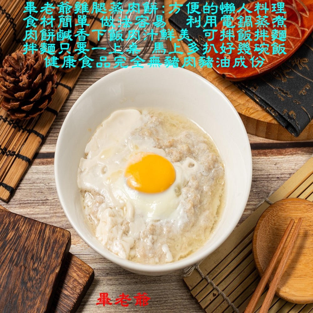 *將退冰蒸肉餅鋪在有深度的盤子放入電鍋,外鍋加1米杯的水,跳開即可上菜,可加一顆蛋,蛋白攪拌肉,蛋黃擺碗中間,另加福菜,花瓜,鹹蛋,玉米粒等,發揮你的創意吧!