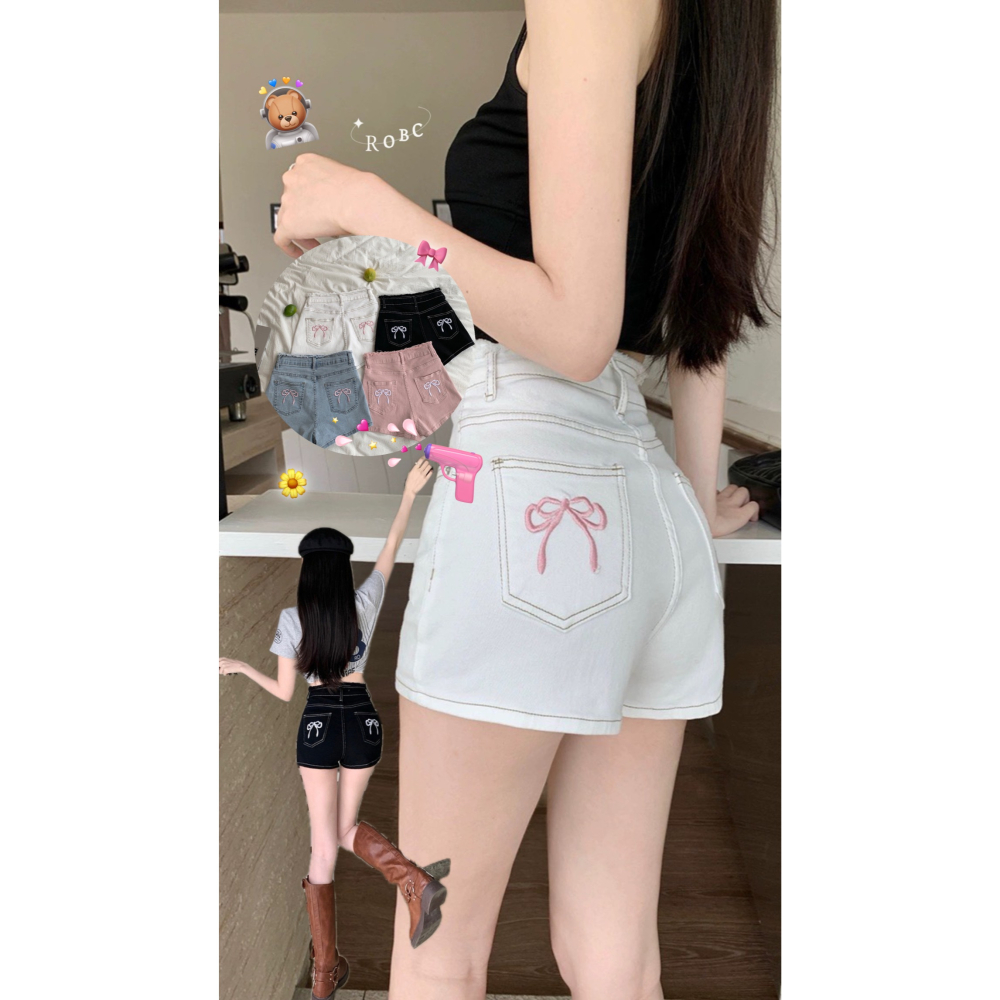 蝴蝶結毛邊高腰彈力牛仔短褲