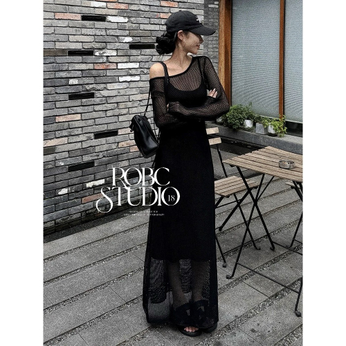 黑色斜肩長袖針織連衣裙🖤(2件套吊帶裙+針織裙)