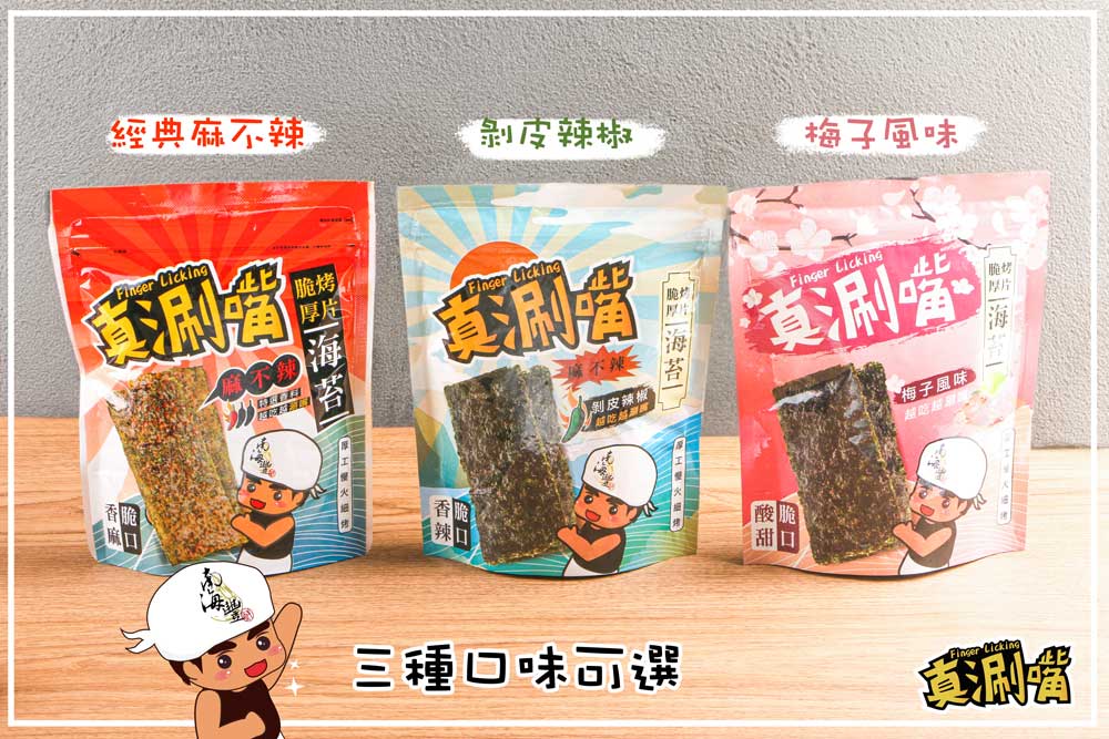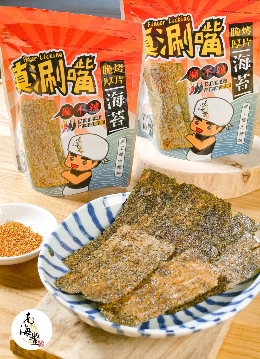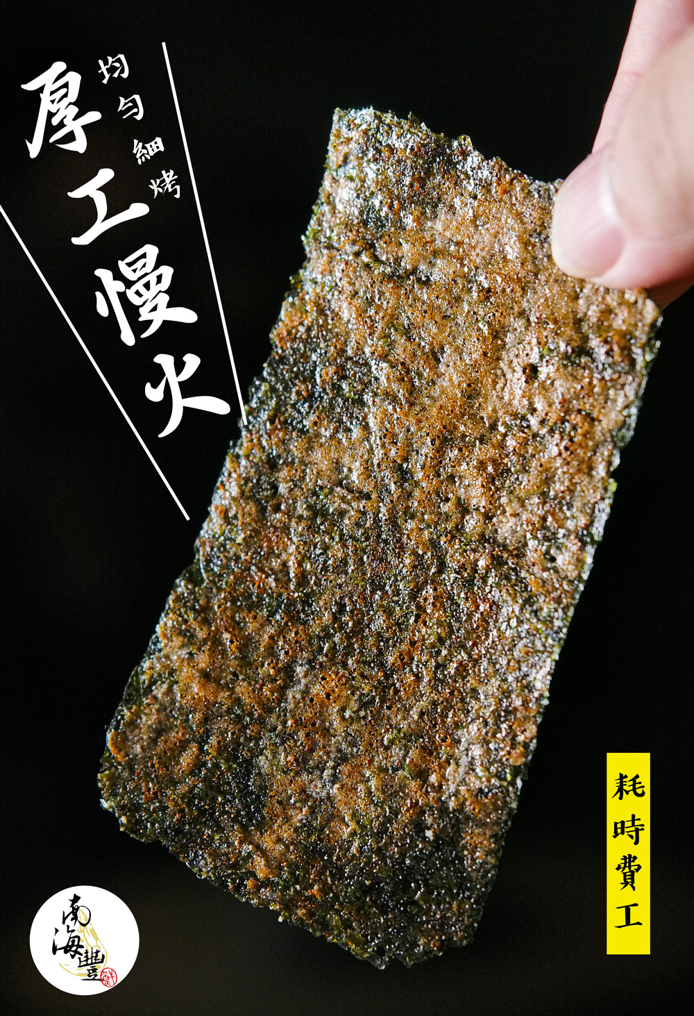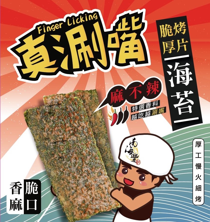 成分:海苔、特級胡椒鹽(碘鹽、味精、白胡椒、胺基乙酸、DL-胺基丙酸、琥珀酸二鈉、5’-次黃嘌呤核苷磷酸二鈉+5’鳥嘌呤苷磷酸二鈉)、黑胡椒、百草香料粉(丁香、八角、花椒、肉桂)、玉米澱粉(非基因改造)、大蒜、二氧化矽、特選棕櫚油(單元不飽和特選棕櫚果實油、脂肪酸山梨醇酐脂)、糖、辣椒粉