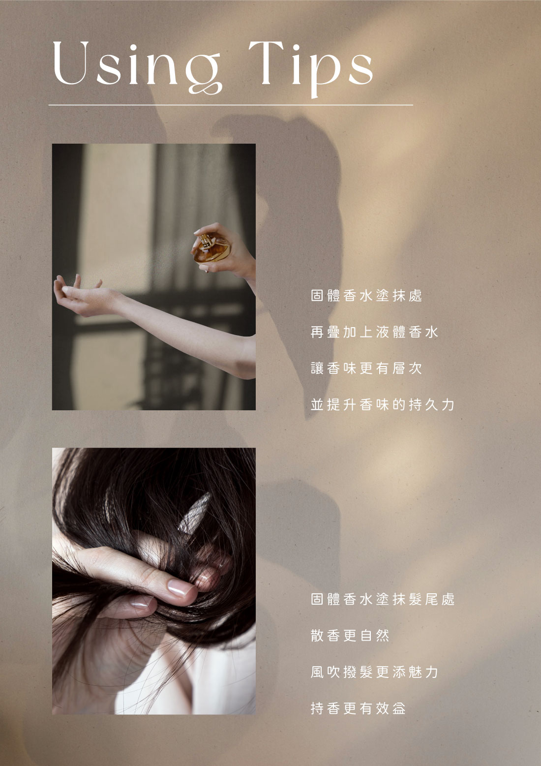 - 固體香水涂抹髮尾處,散香更自然,風吹撥髮更添魅力,持香更久。