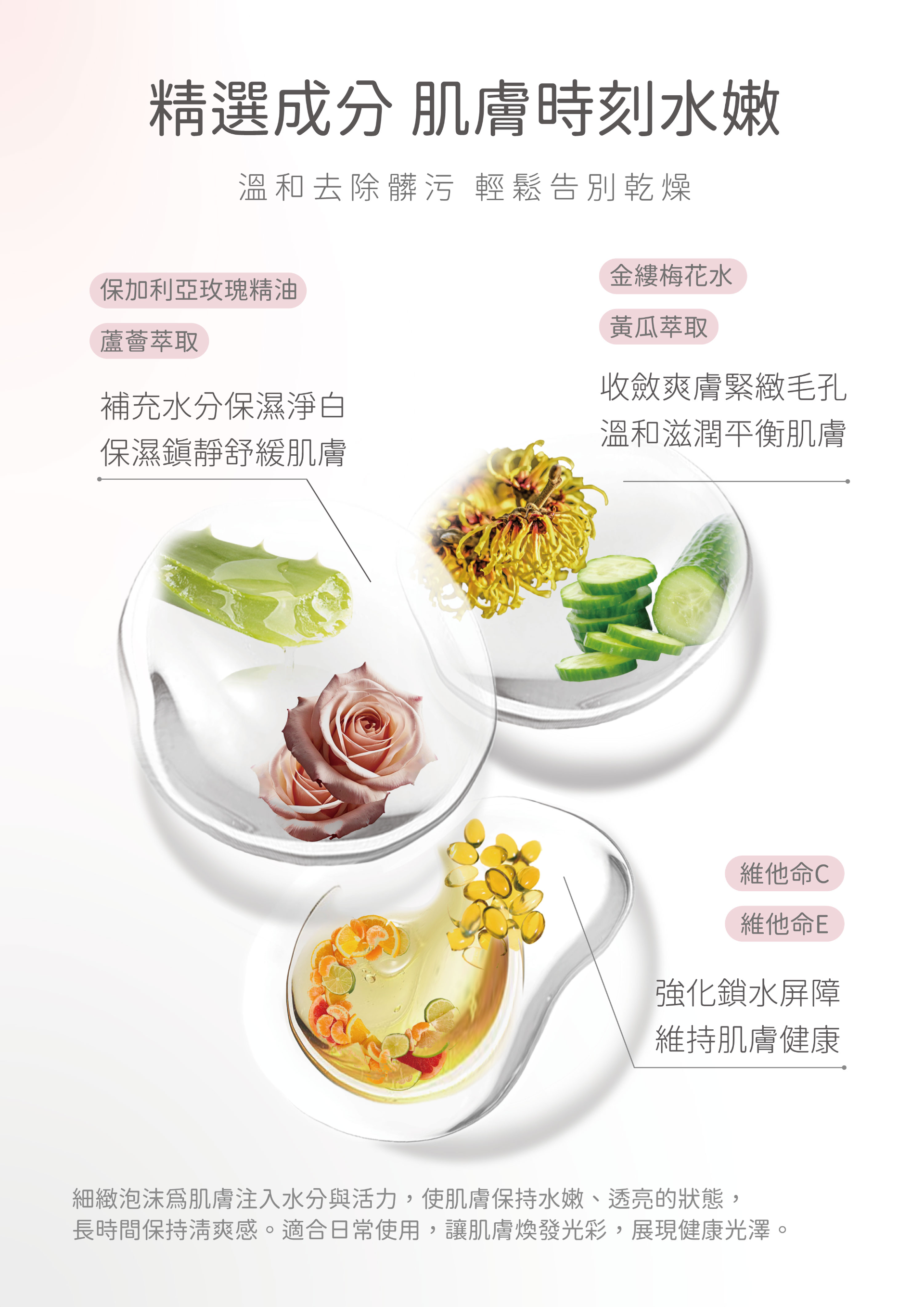 來自保加利亞的大馬士革玫瑰精油,天然溫和,幫助舒緩乾敏膚質,洗完不緊繃、不乾癢,留下柔嫩水感。