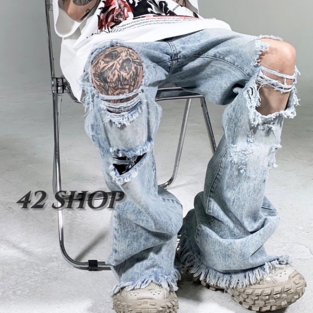 𝟒𝟐 𝐬𝐡𝐨𝐩 | 小眾嘻哈街頭膝蓋大破洞寬鬆毛邊微喇牛仔褲
