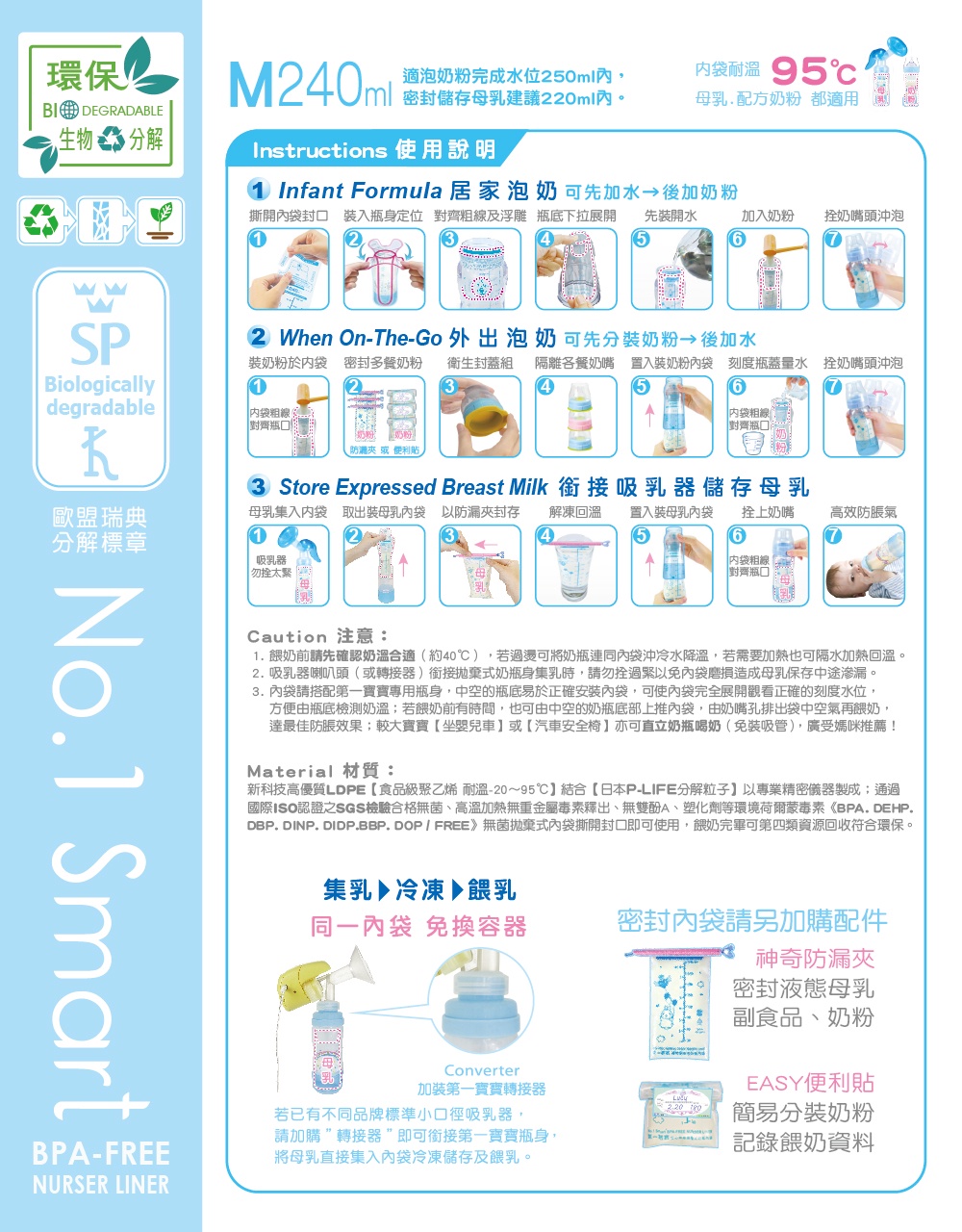 •1.裝於第一寶寶免洗奶瓶身中,可銜接吸乳器集入母乳冷凍儲存。