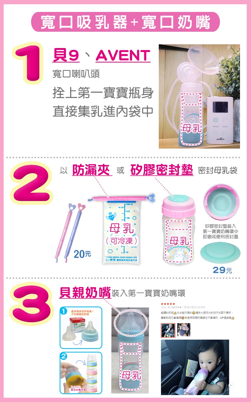 •1.裝於第一寶寶免洗奶瓶身中,可銜接吸乳器集入母乳冷凍儲存。