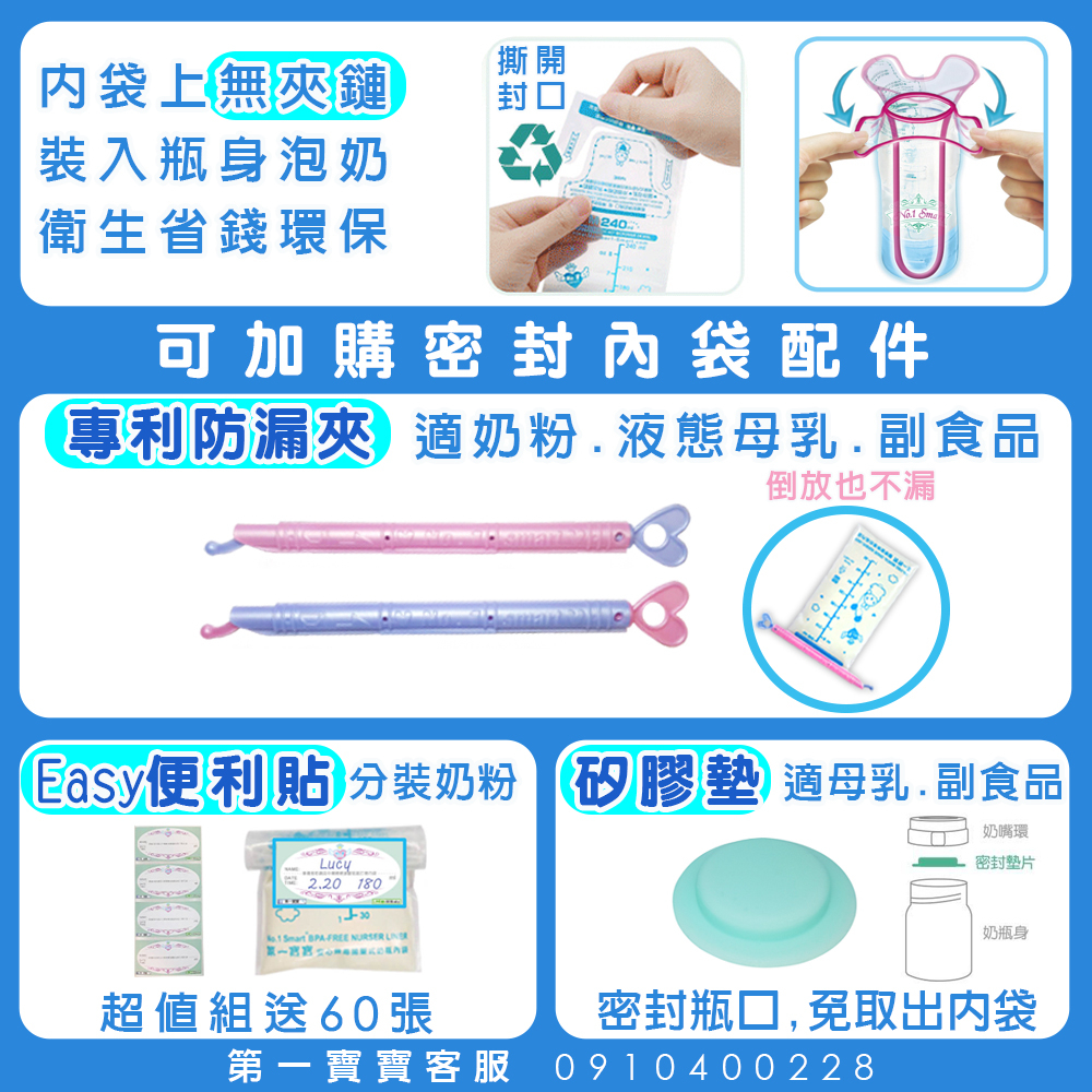 (單購內袋可沖泡奶粉 ,若要密封袋口儲存請另加購"專利神奇防漏夾"; 或超值組合有內含)