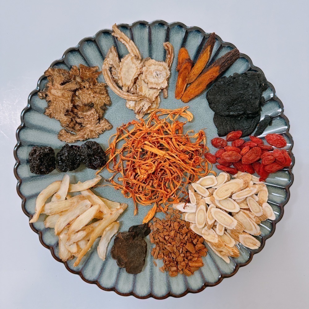 - 成分:黃耆、熟地、玉竹、蟲草、枸杞、川芎、何首烏、當歸、打桂、炙甘草、黑棗