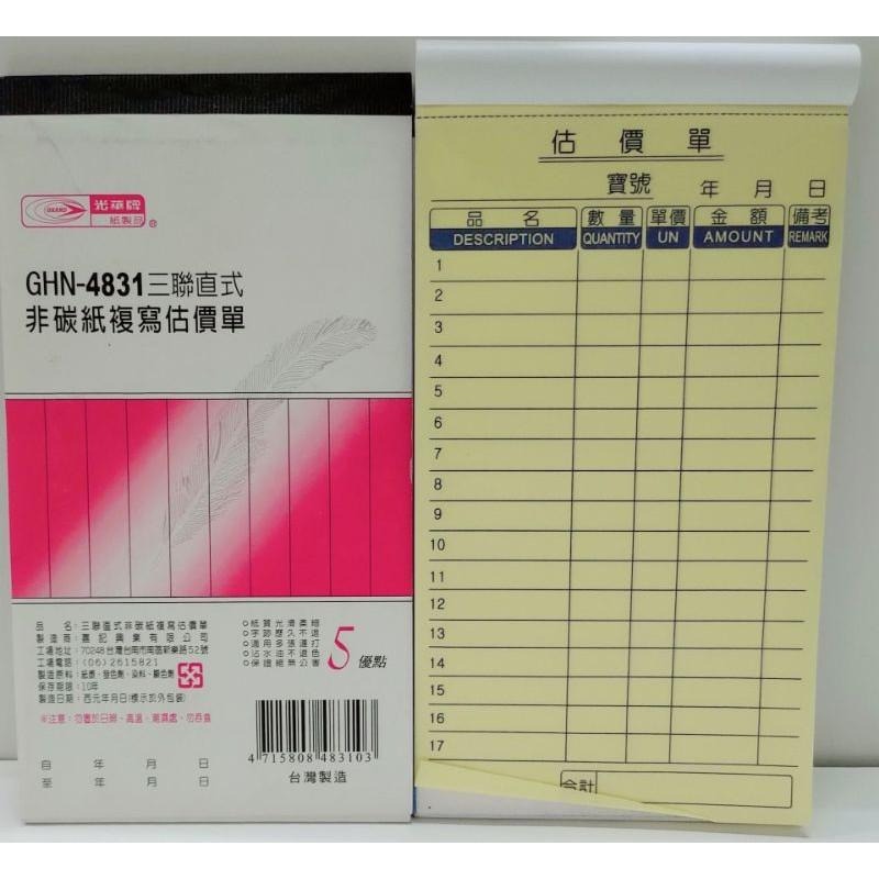 光華牌 GHN - 4831 三聯直式、4852 二聯直式、4853 三聯直式 非碳式複寫 估價單