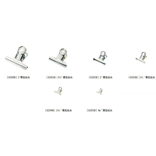 產品介紹 : 高夾持力,堅固耐用 0200B ( 3" ) 76mm ( 一盒 36 個入 ) 0201B ( 2½" ) 64mm 0202B ( 2" ) 51mm 0203B ( 1½ " ) 38mm ( 一盒 72 個入 ) 0204B ( 1¼ " ) 32mm 0205B ( ⅞ " ) 22mm