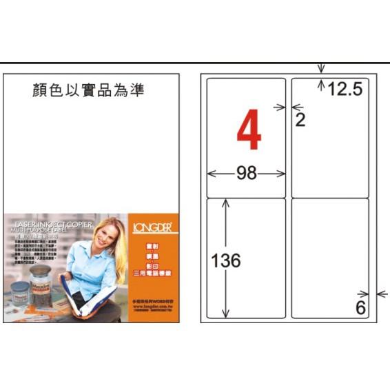 龍德 LD-856-W-C A4 電腦標籤 ( 98 * 136 mm ) 白色 4格 20張入