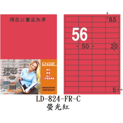 龍德 LD-824-FR-C 電腦標籤 螢光紅 56格 標籤 貼紙 雷射 影印 專用 螢光 LONGDER