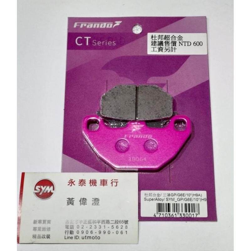 永泰機車行 Frando 杜邦超合金 煞車皮 GT GP 新名流 新迪爵 G6E H9A 來令片 來另片 前碟皮