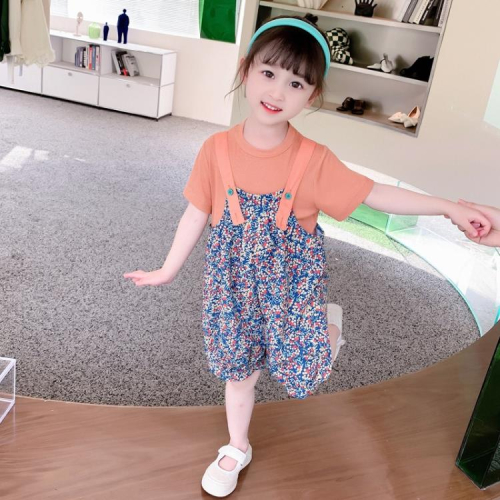 寶貝童裝女童夏裝套裝網紅寶寶夏季韓范洋氣時髦2短袖碎花背帶褲兒童3夏款